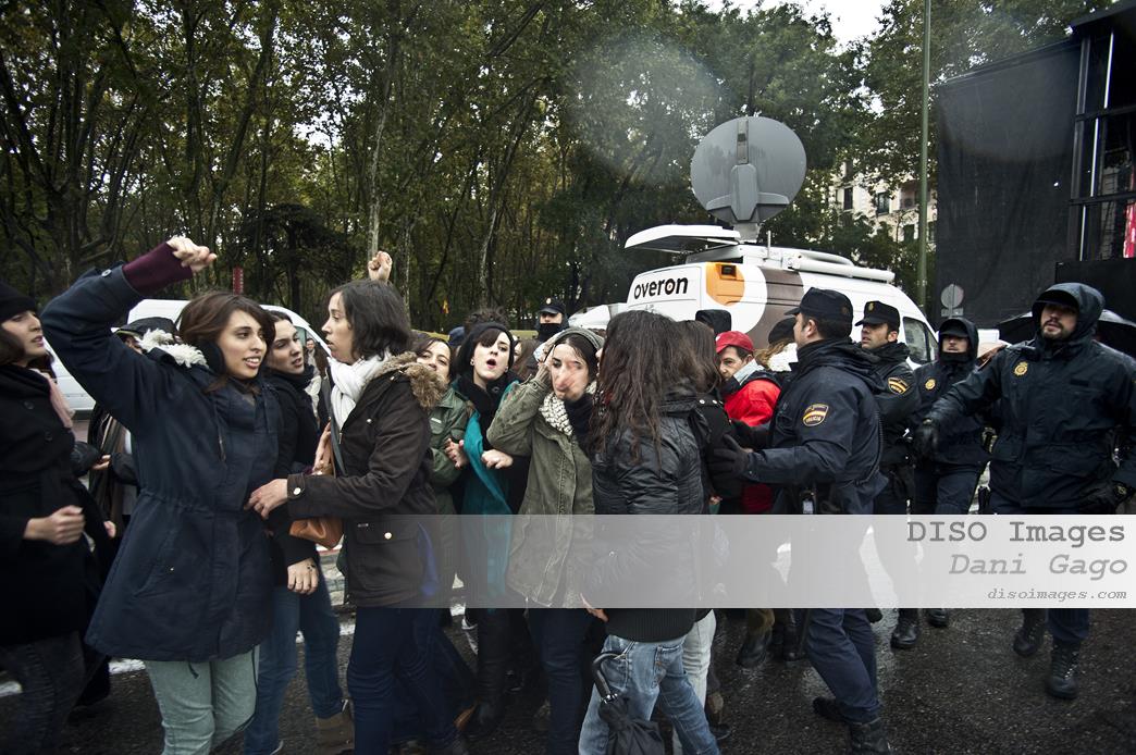 Madrid, 1. Un grupo de mujeres de distintos colectivos feministas sacan una pancarta y gritan consignas a favor del aborto en una manifestación antiabortista